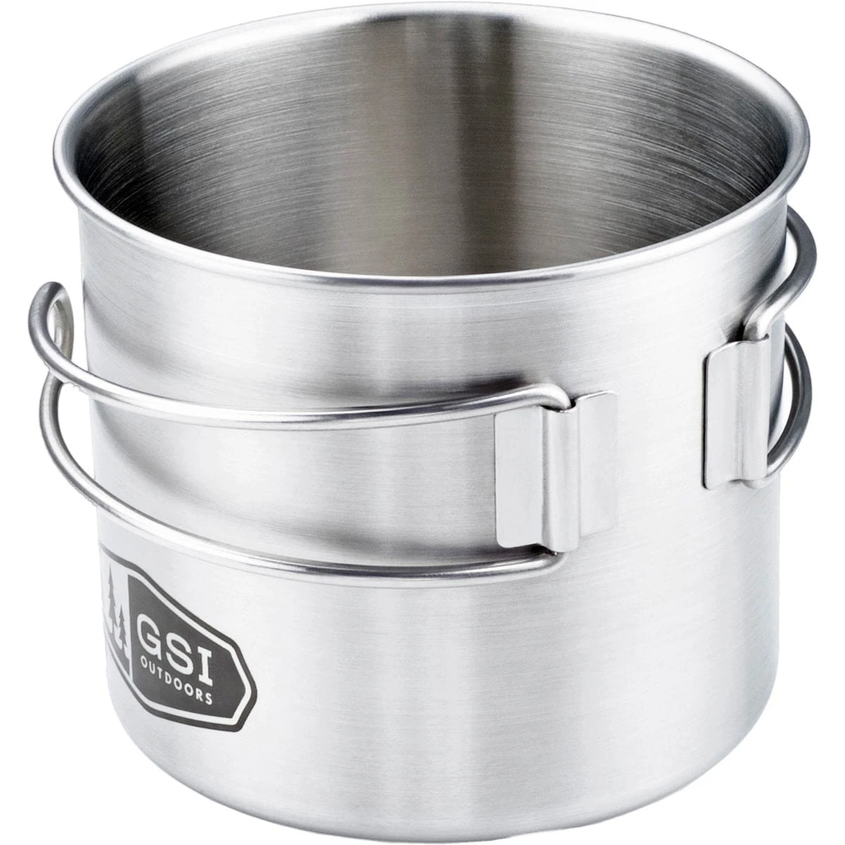 Schöne Edelstahltasse Bottle Cup von GSI, welche so designed wurde, dass sie platzsparend über z.B. eine 1 Liter Nalgene Trinkflasche mit Ø 9,25 cm passt. Mit genug Kapazität, um auch als Minitopf zu fungieren. Dank der faltbaren Griffe sehr gut zu verstauen.